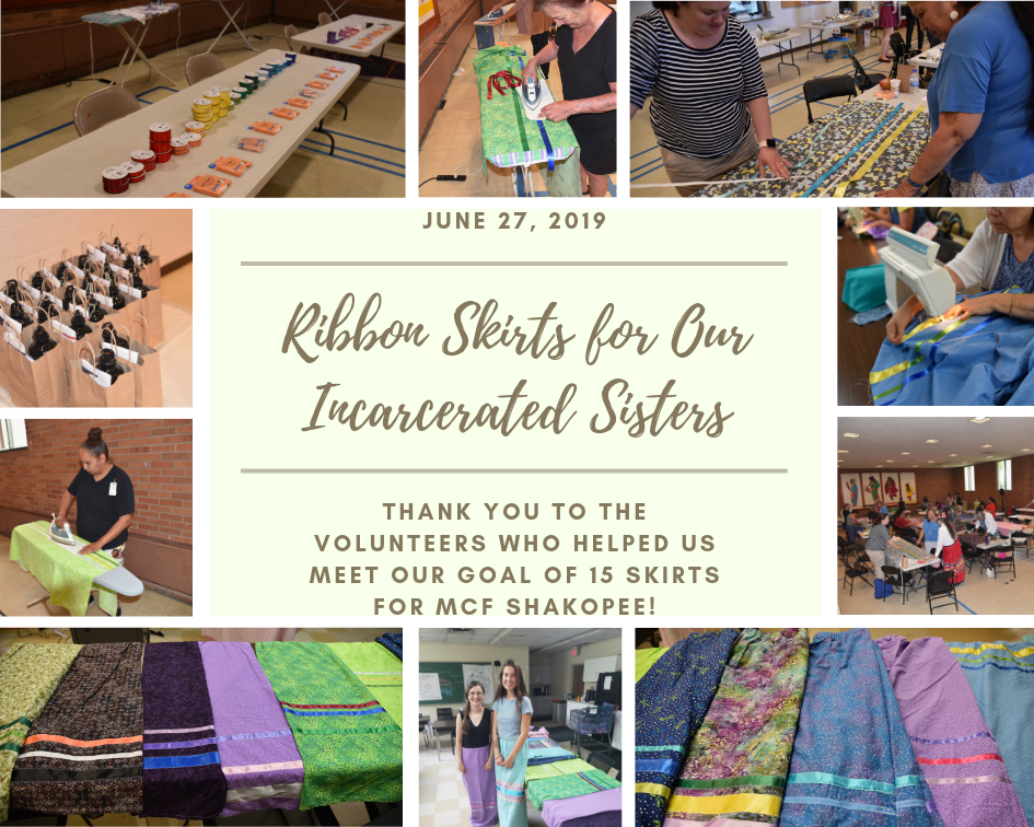 Thank you to all the volunteers who helped make the June 27 Ribbon Skirts for Our Incarcerated Sisters gathering a success! The Religious Services Department at MCF Shakopee requested 15 ribbon skirts to be worn by our incarcerated relatives during sweat lodge, powwows, and ceremonies. With the help of more than 30 volunteers, we received a teaching from Ojibwe Great Grandmother Mary Lyons and completed 10 skirts during the event. Since then, MIWRC staff finished 5 more skirts in order to deliver the full donation to Shakopee as requested. See below for some feedback from the event attendees and a slideshow of photos!