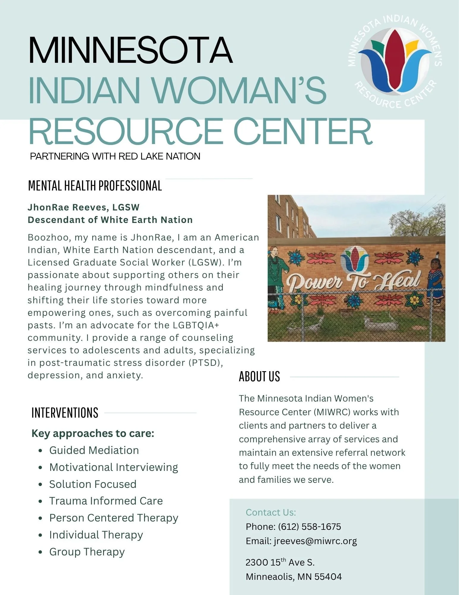 The Minnesota Indian Women’s Resource Center is a nonprofit organization dedicated to helping Native women and families strengthen their values, overcome challenges, and build stability. Through services rooted in tradition, advocacy, and community programs, we support individuals and families in creating safe, strong, and thriving futures. To learn more about MIWRC, please visit: www.miwrc.org.